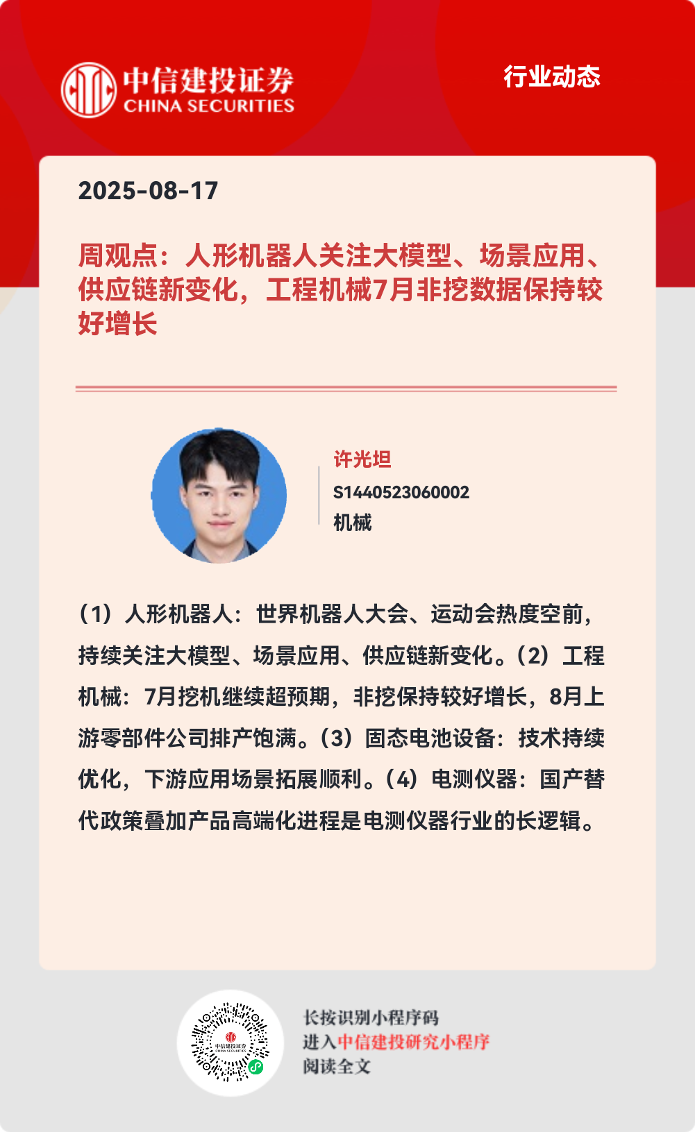 (1)人形机器人:世界机器人大会、运动会热度空前,持续关注大模型、场景应用、供应链新变化。(2)工程机械:7月挖机继续超预期,非挖保持较好增长,8月上游零部件公司排产饱满,内、外资客户需求均有恢复;中长期来看,工程机械行业国内、海外大周期同步向上,基本面持续向好。(3)固态电池设备:技术持续优化,下游应用场景拓展顺利。(4)电测仪器:国产替代政策叠加产品高端化进程是电测仪器行业的长逻辑。